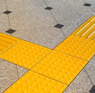 Pisos em alto-relevo, com formas que auxiliam pessoas com deficiência visual a poderem caminhar em um local com mais segurança. Acessibilidade e inclusão com qualidade em seu ambiente.